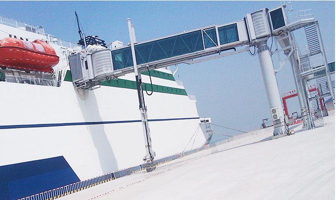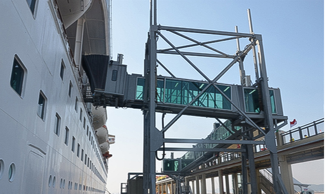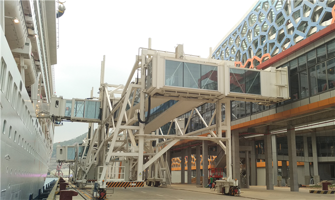 旋轉伸縮式登船橋是通過伸縮通道的旋轉和升降運動對接候船樓和郵輪的登船設備,此種登船橋采用中集天達自主研發的四輪驅動系統和控制系統,能夠滿足登船碼頭惡劣的工況和完美對接不同型號的郵輪,同時活動渡板跟隨技術能夠補償郵輪隨潮汐變化的上下波動,接船服務范圍可覆蓋碼頭岸線約±30米,適應垂岸距離較大的碼頭和各種噸位的客滾船/郵輪的對接。中集天達-旋轉伸縮式登船橋 -
